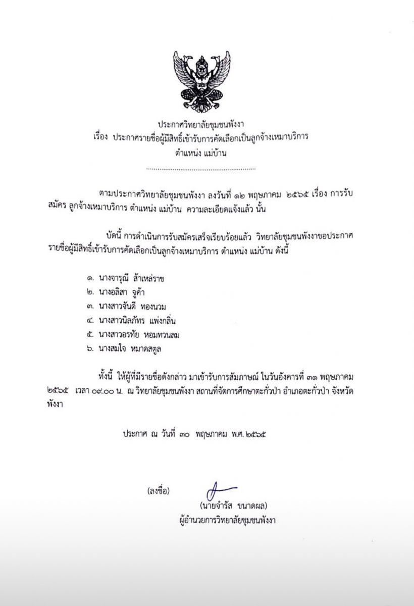 ประกาศรายชื่อผู้มีสิทธิ์เข้ารับการคัดเลือกเป็นลูกจ้างเหมาบริการ ตำเเหน่งเเม่บ้าน