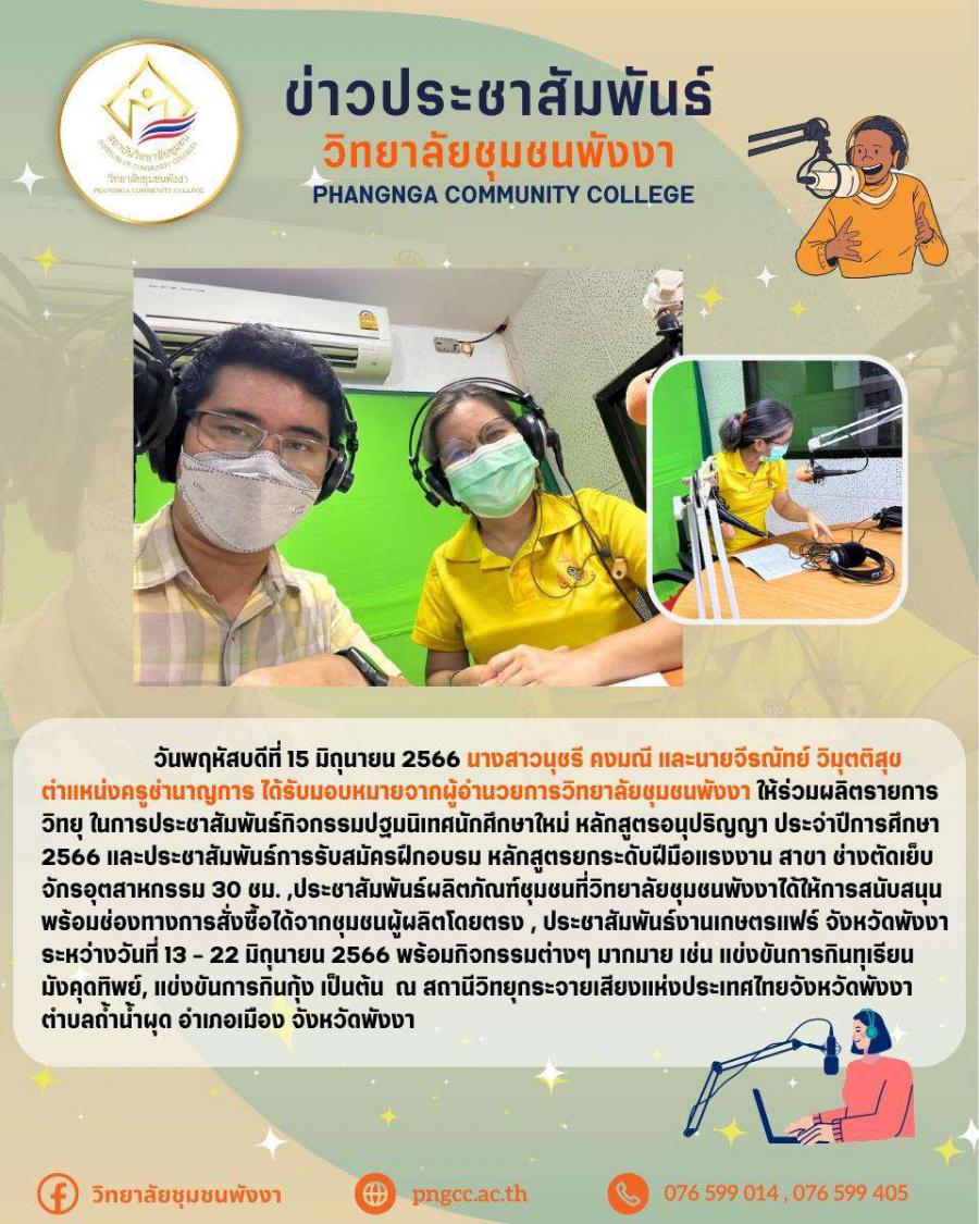 ร่วมผลิตรายการ วิทยุ ในการประชาสัมพันธ์กิจกรรมปฐมนิเทศนักศึกษาใหม่ หลักสูตรอนุปริญญา ประจำปีการศึกษา 2566
