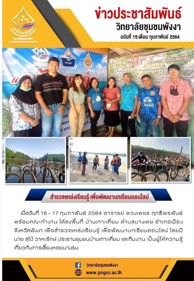 เมื่อวันที่ 16 - 17 กุมภาพันธ์ 2564 อาจาร์ย พวงเพชร ฤทธิพรพันธ์ พร้อมคณะทำงาน ได้ลงพื้นที่ บ้านเกาะเคี่ยม ตำบลบางเตย อำเภอเมือง จังหวัดพังงา เพื่อสำรวจแหล่งเรียนรู้ เพื่อพัฒนาบทเรียนออนไลน์ โดยมี นาย สุโบ๊ วาหะรักษ์ ประธานชุมชนบ้านเกาะเคี่ยม และทีมงาน เป็นผู้ให้ความรู้เกี่ยวกับการเลี้ยงหอยนางรม