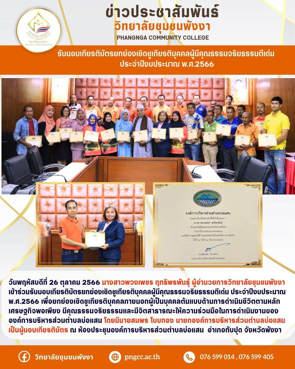 รับมอบเกียรติบัตรยกย่องเชิดชูเกียรติบุคคลผู้มีคุณธรรมจริยธรรมตีเด่น ประจำปีงบประมาณ พ.ศ.2566